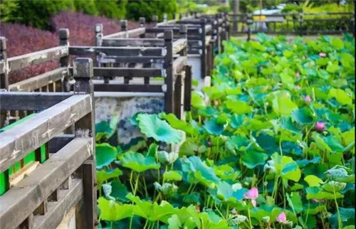 干凈并具有曲線弧度美的小路分布期間,路的兩側(cè)有蘆葦片片蕩漾、搖曳多姿,以小型瀑布、花架為襯托,充分讓人感受到小橋流水人家的自然風(fēng)光。荷花盛放,蘆葦叢生,紫薇石榴零星的點綴其間,是消夏散步的好地方。