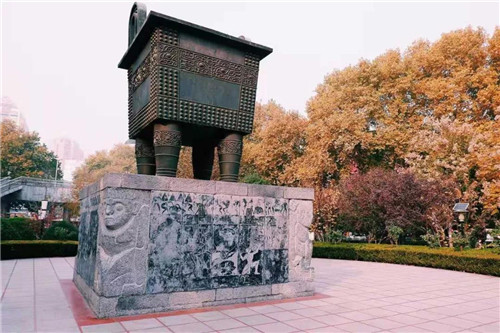 沿著商城路向西走,在商城路人民路的交叉口,有一個(gè)街頭公園,公園的核心是一個(gè)大鼎,雖然是仿制的,氣勢(shì)倒是一點(diǎn)都不遜色于博物館里的藏品。