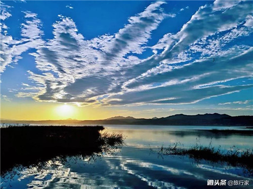 日出時分的陸渾湖,儼然是一幅畫。太陽升起時,霞光萬丈,厚厚的云層鑲上了金邊,湖面煙霧繚繞,瞬間被這流光溢彩的光芒染上了幾分艷麗的朦朧色彩。