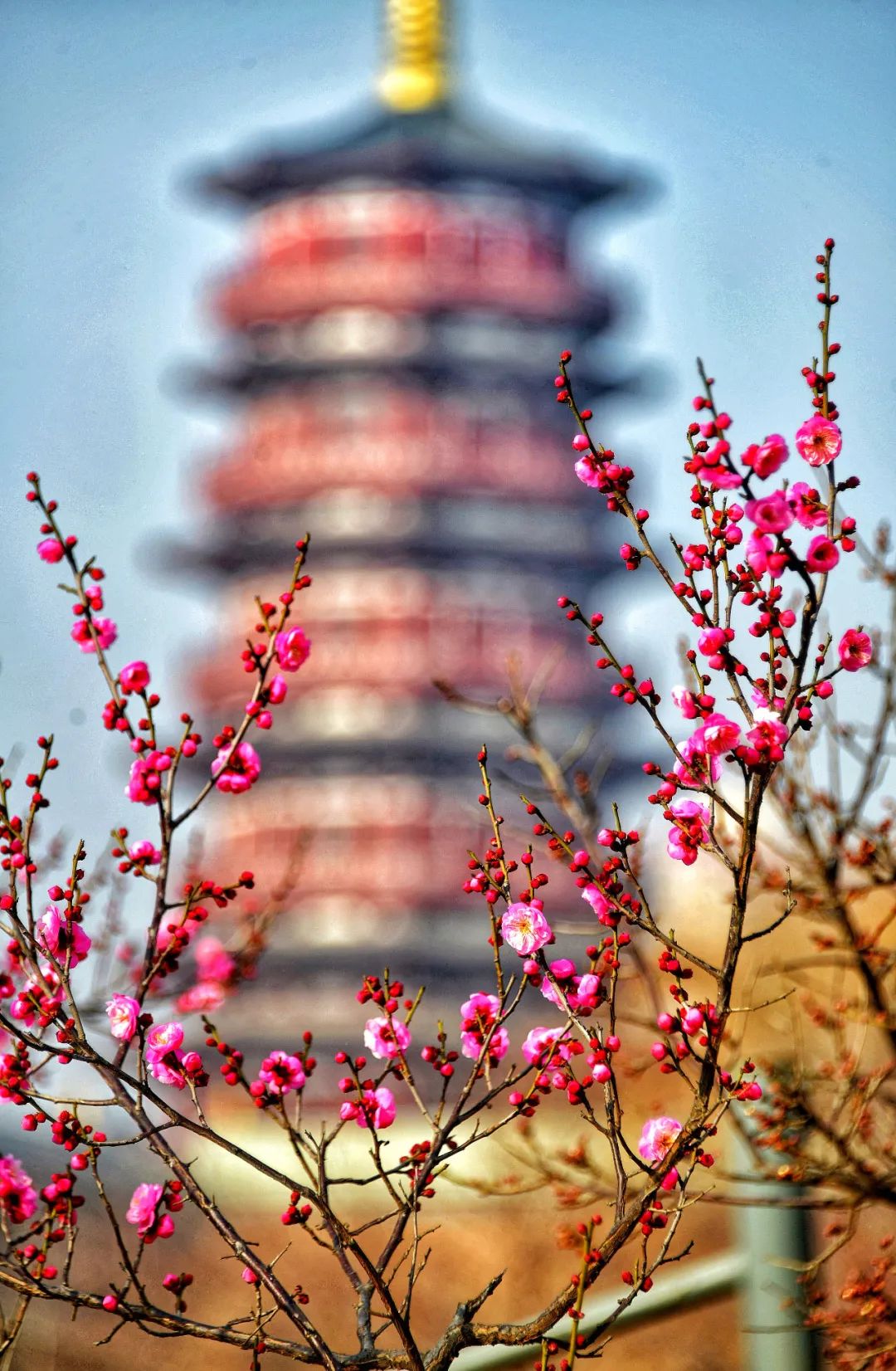 朱櫻塔東邊的梅花已然盛放,吸引著眾多攝影愛(ài)好者賞花拍照,梅林映襯著朱櫻塔,十分雅致。
