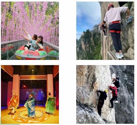 路線2:十里畫屏入口——(飛拉達(dá)攀巖、騰云棧道二選一)——玻璃觀景臺——山頂天宮劇場——下山步道滑索——坐索道下山