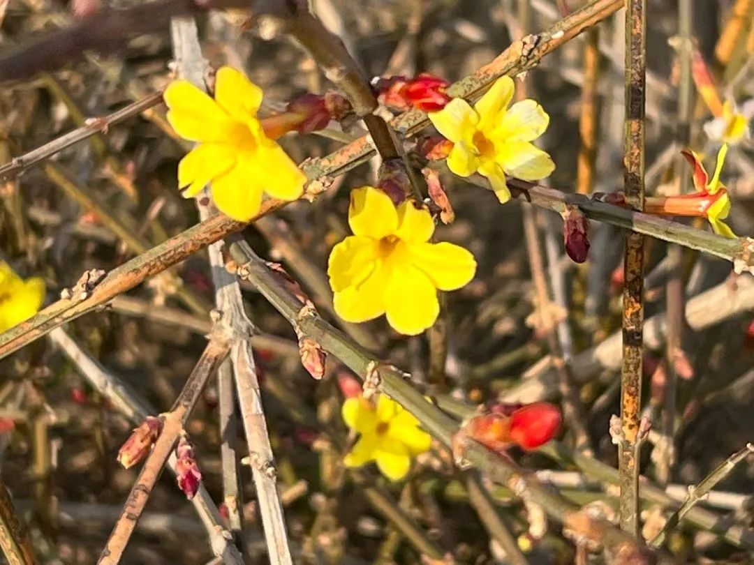 在洛浦公園,健身步道兩旁,散布著星星點點的黃色,在早春時節(jié)格外顯眼——連翹花、迎春花零星開放,蠟梅已進入盛開期。