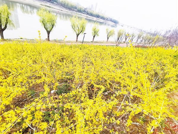 一色菜花十里黃,好風(fēng)斜日送微香。沙潁河兩岸和周口植物園周邊,一片片油菜花、連翹花盡情地釋放芬芳,金黃的色彩帶來春日的浪漫,天地之間一片金黃,隨風(fēng)搖曳美不勝收。