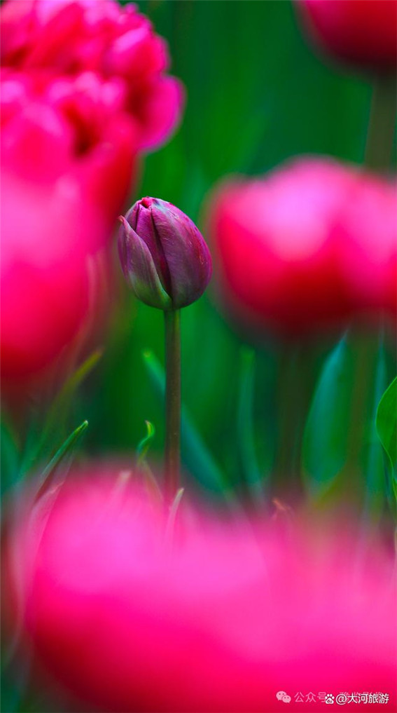 我們可以選擇一朵漂亮的郁金香,作為攝影主體,然后再選一、兩朵稍微的小一點(diǎn)的,作為攝影陪體;蛘呤抢糜艚鹣愕母叨炔罹,拍攝“鶴立雞群”;也可以利用色彩差距,拍攝“萬綠叢中一點(diǎn)紅”。如果兩朵花的大小差不多,虛化攝影陪體,也可以突出攝影主體。