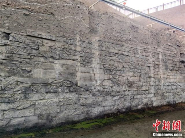州橋遺址橋體兩側(cè)的海馬仙鶴圖,展示了北宋御街及州橋建筑的富麗堂皇。劉鵬 攝