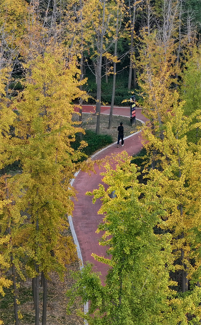 11月5日,記者在中原西路鄭州一中對(duì)面的生態(tài)廊道看到,部分兩排高大的銀杏樹(shù)直插云霄,樹(shù)上的葉子已黃了將近一半,在陽(yáng)光的照耀下分外閃爍著迷人的金光。
