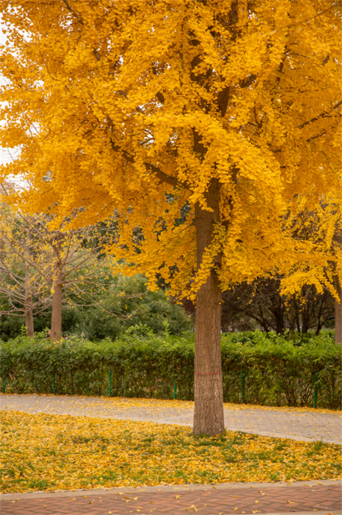 文博廣場(chǎng)。農(nóng)業(yè)路文博東路交叉口的文博廣場(chǎng)是銀杏種植最密集的廣場(chǎng),整個(gè)公園除了中軸線上有兩排法桐,其余區(qū)域目之所及皆是銀杏樹(shù),整整齊齊形成“樹(shù)陣”,待銀杏黃遍,金黃一片煞是耀眼。