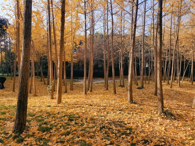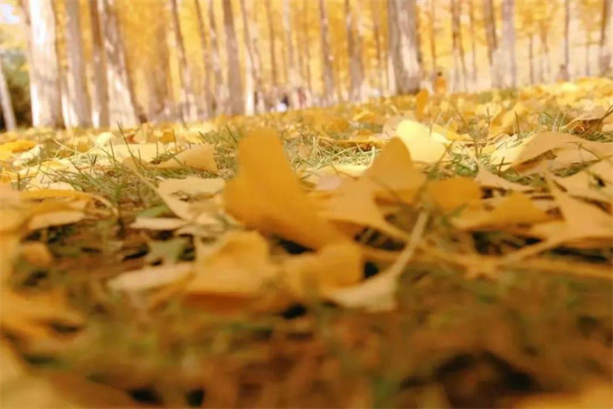 綠色的草地上,撒滿了金燦燦的扇形銀杏葉,遠遠望去,有種滿城盡帶黃金甲的感覺,十分誘人!