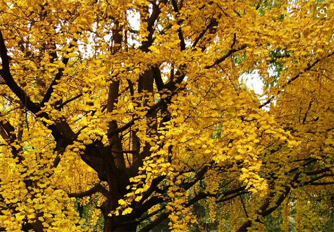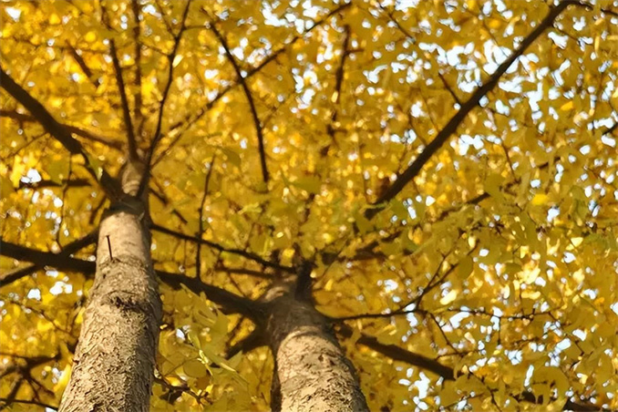 陽光下金燦燦的樹葉連成一片,絢麗奪目。一陣風吹過,扇形葉片飄灑而下,如漫天飛舞的金色蝴蝶。而從高處俯瞰,金黃的銀杏樹盎然挺立于天地間,十分壯觀。