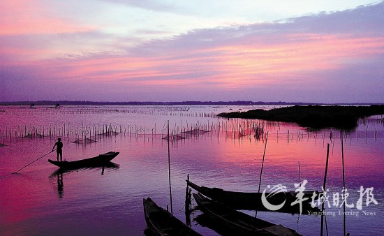 ?跂|寨港紅樹林國家級自然保護區(qū)晚霞下的漁舟