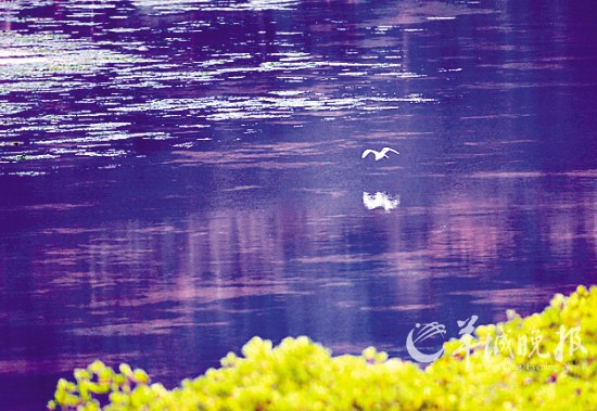 一只白鷺在三亞紅樹林保護區(qū)的河面上飛過