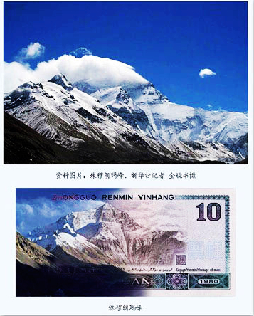 珠穆朗瑪峰的地位正如它的高度,是永遠(yuǎn)不能被忽視的。第四套人民幣中10元的紙幣選擇它做背面圖案。珠穆朗瑪峰位于我國和尼泊爾交界的地方,從中國境內(nèi)眺望珠峰,它像一座金字塔,威嚴(yán)地聳立在一排雪峰之間。這張錢幣整體色調(diào)以藍(lán)色為主,設(shè)計它的時候就考慮到珠峰適合這種冷色調(diào)來表現(xiàn)。