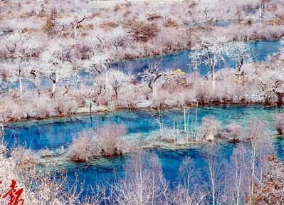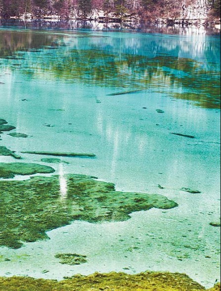 水是九寨溝的靈魂。繁花落盡,九寨溝仍然蒼翠清朗,100多個海子被空寥的氣氛籠罩上一層清華,純粹的撲朔迷離。藍(lán)色的湖水上各種形狀厚薄不一的潔白的冰塊、冰花。樹正溝、日則溝的大部分海子都沒有結(jié)冰,依然泛著青、藍(lán)、綠等不同色塊。
