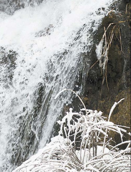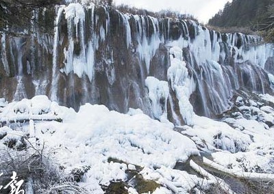 銀裝素裹的樹枝和奔流的瀑布是九寨溝冬季獨有特色