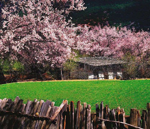 在林芝,有一個(gè)三面環(huán)山的賞花勝地,叫做桃花溝。桃花溝是一片天然野生桃林,高處有水源,四周林木蔥蘢,終年碧綠蒼翠,間有流水,清澈見底。每年的三、四月,寒意未盡,但是這片巨大的野桃林給林芝帶來(lái)了一片壯麗的春天,當(dāng)遠(yuǎn)方的雪峰還有皚皚白雪,桃花卻已如醉霞緋云般地爭(zhēng)相斗艷。