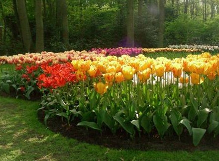 荷蘭是郁金香之國。荷蘭著名的庫肯霍夫公園是世界上最大的郁金香公園,每到3月底,六百多萬株的鮮花預(yù)報春來的訊息,尤其是色彩斑斕的郁金香,粉紫、鮮黃、嫩紅、純白,仿佛無邊的花毯濃艷熱烈地鋪展在大地上,毫不羞怯地展露著迷人的風(fēng)采。
