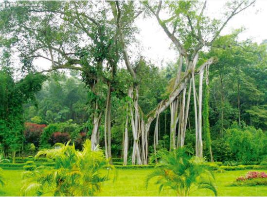 到打洛,沒有不看獨(dú)木成林的。這株樹木高達(dá)28米,樹齡在200年以上,屬熱帶、亞熱帶的大葉榕,該樹主干中部平生的眾多氣生根,順樹而下,相互交纏,盤于根部,左右兩側(cè)的主枝上,有32條大小不等的氣生根垂直而下,扎人泥土,形成根部相連的叢生狀支柱根,塑造出一樹多干的成林景致。