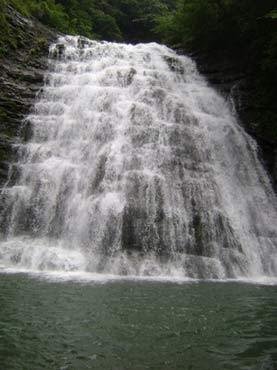 玉簾瀑布位于三清山石鼓嶺上的幽谷叢林中。此瀑分?jǐn)?shù)股,有的緊依崖壁,蜿蜒曲折,時(shí)斷時(shí)續(xù);有的懸空而下,如水簾垂下。距此瀑一里左右處,又有一大瀑布從懸?guī)r上飛落,高34米余,上寬18米余,下寬30米,遠(yuǎn)看宛如一掛白玉珠簾高懸于天際,近看又似萬(wàn)斛珠璣,凌空抖落。