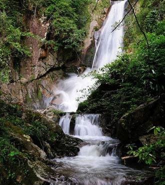 金竹瀑布群位于樂安縣金竹鄉(xiāng)畬族聚居地的嚇通村境內(nèi),距離縣城72公里。該山山勢雄峻,古木參天,山泉甘冽,綠意盎然,自然形成形態(tài)各式各樣的大小瀑布的總落差,高達(dá)400多米。其瀑布之多,總落差之大,在全國都屬罕見。其中,氣勢磅礴、飛珠濺玉、形態(tài)奇異、特色鮮明的瀑布計(jì)有狗腦瀑、點(diǎn)光潭、雙龍?zhí)兜,其壯美氣勢令人嘆為觀止。有專家贊嘆說:“廬山三疊素以落差為美,黃果樹瀑布以面積寬為美,而嚇通瀑布兩者兼而有之。”