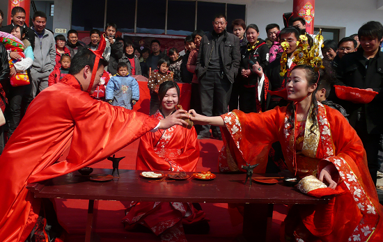 9時整,新人裝扮一新,全新的漢婚禮服讓新婚夫婦顯得格外精神。