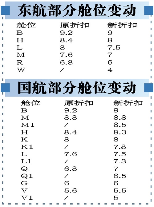 東航:B艙9.2折變9折;“H艙”從8.4折調回8折;國航:微調9個子艙位票價;新增5個子艙位;川航:T艙原來是9.2折,現在變成“9.2折或9折”