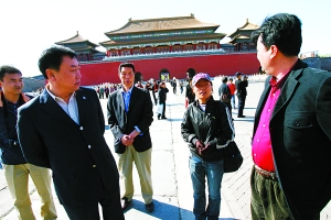北京市旅游局副局長于德斌(左2)帶隊檢查旅游市場時,一名婦女(右2)上前向他自薦黑導游。昨日(15日),北京市旅游局聯(lián)合城管、治安總隊等到故宮檢查無證導游帶團現(xiàn)象。由于都是便裝,執(zhí)法人員還沒走到太和殿,一名無證女導游就迎了上來,詢問是否需要導游。執(zhí)法員隨后表明身份,要求她到指定地點接受處理。