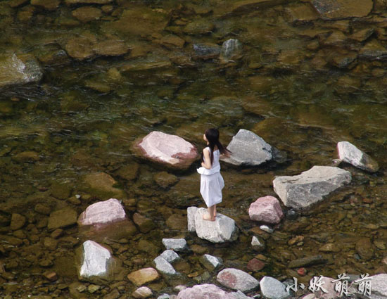 我們先走水路,往河里一看不要緊,發(fā)現(xiàn)一白衣長發(fā)美女!看這姿勢我還以為她要下河沐浴呢?不過人家只是在擺poss照相。你看這長發(fā)飄的,動態(tài)美十足!可惜我沒有看到正面。