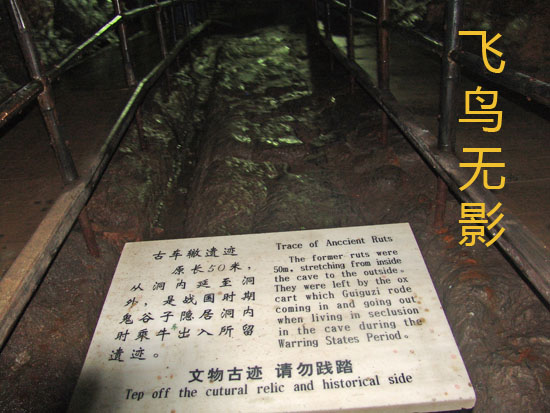 進到洞里面,路中間有個古車轍痕跡,原長50米,從洞內(nèi)延伸至洞外,是鬼谷子隱居洞內(nèi)時,乘牛車出入時留下的遺跡。