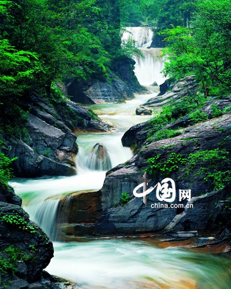 早上一大早就醒了,起來(lái)洗漱完畢出門,小馬這邊現(xiàn)在沒(méi)有早飯,不過(guò)在岸上村吃很方便的。早餐吃了小米粥、胡辣湯、油條、雞蛋餅等,不貴,大都在1-2元,一頓飯下來(lái)大概六七塊錢。吃完飯直接到岸上村對(duì)面的售票處買票,在車站等景區(qū)的公交車,這時(shí)不到8點(diǎn),有人尚且不多,大批的團(tuán)隊(duì)還沒(méi)有趕到。小馬說(shuō),周一是人最少的一天,周六和周日山里熙熙攘攘,根本沒(méi)法看,所以慶幸晚走了一天。上了車進(jìn)山,邊聽(tīng)導(dǎo)游講解,邊看風(fēng)景,果然風(fēng)光無(wú)限。根據(jù)小馬的建議,我們沒(méi)有在紅石峽下車,而是直奔景區(qū)盡頭的三條溝。由于前些天連日降雨,景區(qū)內(nèi)到處流水潺潺,據(jù)介紹水量已經(jīng)達(dá)到了最佳的觀賞水平。下了車往里走幾步就是順流而下的小溪,溪水清澈見(jiàn)低,確實(shí)是山清水秀的好地方。我們決定趁人少先去潭瀑峽,一路上三步一瀑、五步一潭果然名不虛傳,邊走邊玩,有些路因?yàn)樗笠呀?jīng)封閉了,大概用了不到一個(gè)小時(shí)走到了盡頭,里面是山崖上面的一條瀑布,還有不大的人字瀑,拍了幾張照片,然后又溜溜達(dá)達(dá)邊走邊玩出了溝。