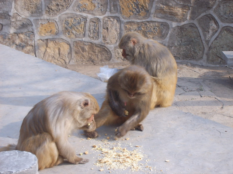 我在景區(qū)門口買的幾包猴食沒有藏好,剛一進(jìn)去就被眼尖的猴子看到了,立馬圍上來搶走了一包。、、喂,別只顧著吃了,中間那個(gè)猴子,說你呢,走光了!
