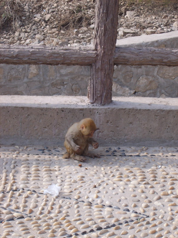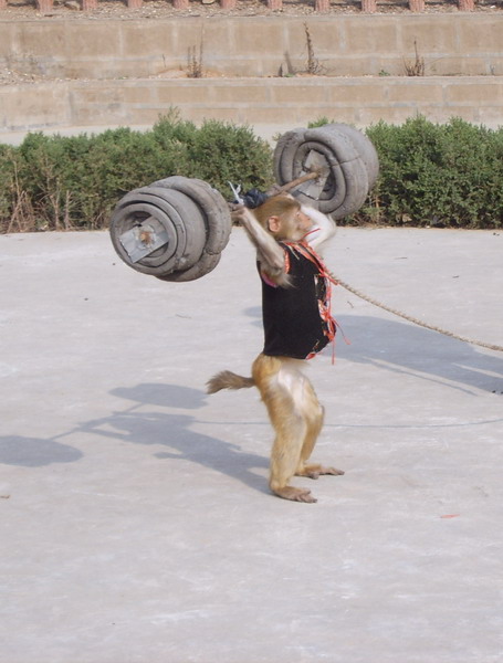 景區(qū)內(nèi)免費的猴子表演——舉重冠軍!記憶中看猴戲是很久很久以前的事情了,耍猴人拿個破鑼猛敲,我們小孩就尋著鑼聲跑上前去,看的津津有味。那時侯特別痛恨耍猴人的鞭子,特別可憐小猴子。