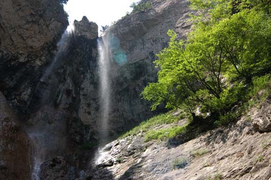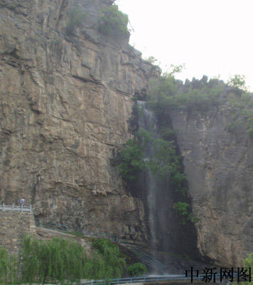 及頂,始見一瀑布,高數(shù)尺。如詩所云:巖山潺潺碧水來,銀絲萬道噴蒼臺。瀑中桓臥一石,菱角狀,仿佛巨鷹,翱翔天際倦了,在此小酣。方覺“棲鷹飛瀑”實至名歸。