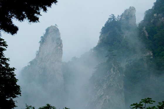 結(jié)果處處碰壁。更恐巨石從天而降,不得不退回原地待守。好在吉人自有天相---遠(yuǎn)處竟有一燈光走來......那光入鬼火般時隱時現(xiàn),駭人至極!最終傳來了馬達(dá)聲---大路近在咫尺!雖落一身傷痕,但終于沿峭壁攀到大路。又經(jīng)一檢票站得知有客店在不遠(yuǎn)處,方安心趕路?偷瓯晨繎已拢_臨溪水。名曰“神農(nóng)山莊”。房價十元一床。老薩倒頭便睡,我與丁溝卻唯恐“天 降大石于斯人也”一夜未眠。第二日卻是陰天。三人行到1500米處便無石階路可行,需攀樹根而上。又到一風(fēng)口頓時狂風(fēng)大作,腳下萬丈懸崖,人在風(fēng)中飄蕩!其驚險勝似華山.轉(zhuǎn)過一巨石,風(fēng)力陡減。三人窩在一凹里稍作休整。再攀一小時左右復(fù)見臺階。抬頭望去已到海拔2153米的“玉皇極頂”。
