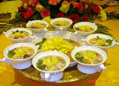 一聽說去洛陽,立刻想到了聞名世界的洛陽水席,喉結(jié)不自覺地上下起伏,吞咽著多余的口水。一到洛陽便遭到了當(dāng)?shù)刂魅说臒崆榻哟噹е覀兤吖瞻死@地進(jìn)了一個(gè)單位的大院,看見一條長長的隊(duì)伍,不知頭了在干什么,從隊(duì)伍頭了出來的人個(gè)個(gè)紅光滿面、大漢淋漓的樣子,好象很滿足,急沖沖地走了。還在排隊(duì)的人們沒有著急的樣子,充滿了必勝的信心。當(dāng)?shù)刂魅藦街弊叩疥?duì)伍前面的房子里嘰哩咕嚕說了兩句,只見窗戶里面一個(gè)滿臉皺褶、頭發(fā)花白的老頭不動(dòng)聲色地點(diǎn)了點(diǎn)頭,不一會(huì)兒大喊道:端了!我們像聽到命令一般迅速一人端走了一大海碗牛肉湯,桌子上已經(jīng)擺上了一大堆直徑20厘米、厚2厘米的饃,我們學(xué)著主人的樣子把饃撕成小塊泡在湯里便吃了起來。