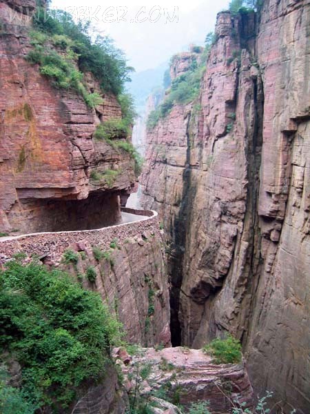 在泉旁休足精神,便復(fù)返郭亮村口,再下紅石橋,可見郭亮水庫(kù)。從此處而下,便是移步一景,處處風(fēng)光無(wú)限,是郭亮景區(qū)的極佳處。這里不僅有天下奇絕的絕壁長(zhǎng)廊——郭亮洞,更有寬廣宏大的赤色崖壁。這里的崖壁,是那種絕對(duì)陡直的、刀削斧劈般的天然“墻壁”,高約百余米,長(zhǎng)可綿延數(shù)十里。貼崖處常可見無(wú)數(shù)岌岌可危的巖柱,與張家界的峰林有一曲同工之妙。就在這樣的筆立崖壁上,郭亮人用手工創(chuàng)造了一條人間奇跡,也付出了生命的代價(jià),村民王懷堂死于亂石。開鑿郭亮洞一開始就是按可通各種車輛的公路級(jí)的標(biāo)準(zhǔn)。而且他們還充分考慮了洞內(nèi)采光,約隔五六米就要開鑿一個(gè)向外的采光口,既便于清理洞內(nèi)的積石,也由于保留了巖柱而對(duì)洞頂起到了支護(hù)作用。從遠(yuǎn)處望去,崖壁依然通體完整,采光口宛若天成,成為丹崖中一個(gè)閃光的亮點(diǎn)。走在洞中,我們不僅會(huì)為這人間偉力而咋舌,更為這郭亮人的執(zhí)著所震撼。小坐采光口,宛若停在空中觀景,可見對(duì)面崖壁美侖美奐,你可以細(xì)數(shù)那些危石和石縫中斜長(zhǎng)的小樹。聽說(shuō),如果有斜陽(yáng)籠罩,還可見紅彩光耀的影象。只可惜,我們來(lái)時(shí)霧氣甚重,太陽(yáng)草草的收了山,未能證實(shí)此說(shuō)。