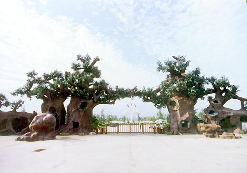 我們現(xiàn)在位于莊園的主大門,它的造型很別致,是由三棵立槐、兩棵臥槐的造型組合而成,總寬度為45米,它有一個很好聽的名字--“龍鄉(xiāng)槐魂”。濮陽是槐樹之鄉(xiāng),國槐是淄陽的市樹。莊園用槐做門,一來表示這里是一個自然生態(tài)園,寓意著人和自然的親和;二來這五棵仿真的古槐寓意著龍鄉(xiāng)淄陽古老文明歷史的滄桑,翠綠的枝葉又象征著濮陽在改革開放的現(xiàn)代化建設(shè)中煥發(fā)出勃勃生機(jī)。