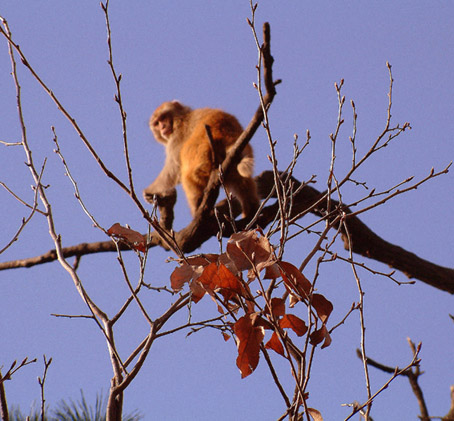 猴群中有一只全身棕色的母猴慈愛的抱著一只全身金黃色只有十幾厘米長的小猴,一只全身深棕色的公猴衛(wèi)士般地守在它們身邊,這一家三口好可愛了!忽然一只大猴子跳到了一根軟樹枝上,嚇了大家一跳,可它卻悠然地蕩起了秋千,一位游客把瓜子撒到了它面前,猴子馬上跳下來,津津有味地嗑起瓜子,樣子極有趣。我們把手中的食物不停的分給猴子,猴群不住的發(fā)出尖叫搶吃食物,忽然從我們左邊跳出了一個體態(tài)很大的猴子,跳到同來的小黃身邊,,我們猜測它是這里的猴王,看它兇狠的瞪著我們的樣子還真有些害怕,為了不發(fā)生意外,我們趕緊轉(zhuǎn)身離開。