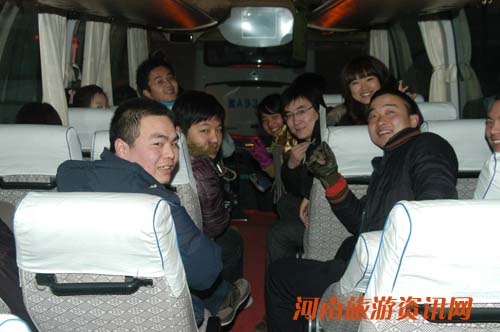 4點(diǎn)45分,客人終于全部到齊,隨著導(dǎo)游員的一聲令下:出發(fā)!車子開動(dòng)了,七輛豪華大巴前后一字排開,車頭上掛著“景區(qū)直通車”的紅色條幅,行駛在紫荊山路上,像極了一列火車,浩浩蕩蕩,場面頗有幾分壯觀。車窗外的行人都不住的朝我們看呢!