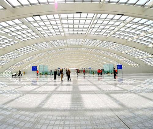 為迎接北京2008奧運(yùn)會(huì)即使開(kāi)業(yè)的3號(hào)航站樓,面積龐大(長(zhǎng)度高大2英里,是世界最大的建筑之一),象征的是一條龍。建筑師福斯特事務(wù)所(Foster + Partners)設(shè)計(jì)的天花板有紅色與黃色區(qū)帶,令人眼花繚亂。如此傳統(tǒng)的配色方案不僅是建筑的特色,還成了乘客們?cè)诤秸緲莾?nèi)的方向指南。
