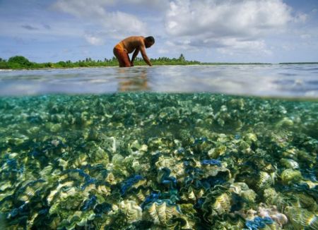 照片中,一名男子站在基里巴斯菲尼克斯群島保護區(qū)巨大的蛤床上。菲尼克斯群島是入選聯(lián)合國教科文組織《世界遺產(chǎn)名錄》新增的5處自然遺產(chǎn)之一,同時也是其中面積最大的一個海洋保護區(qū);锇退故翘窖笾胁康囊粋小國,由吉爾伯特群島、萊恩群島和菲尼克斯群島構(gòu)成。