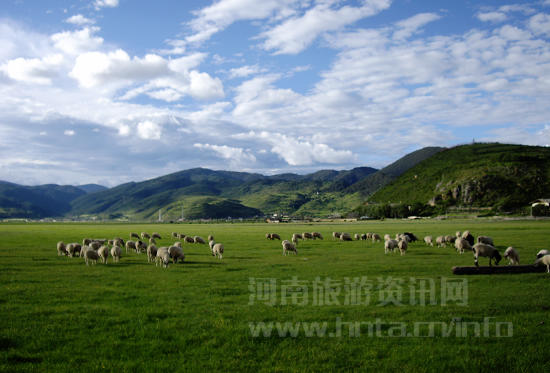 雨季還沒有到來,草坪依然翠綠。 我向羊群走去,一見陌生人過去,羊群有組織性地一起散開。