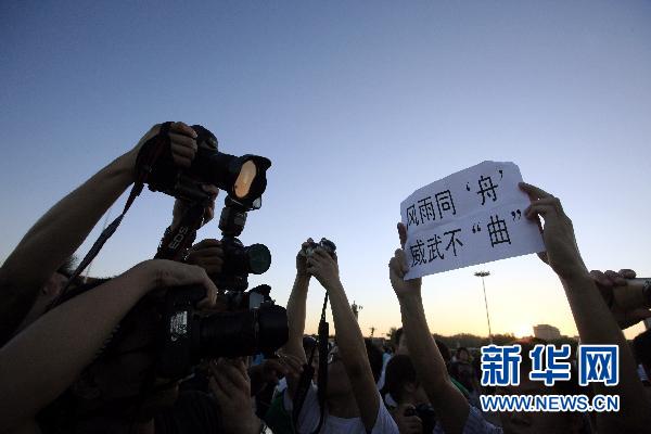 8月15日,北京天安門廣場降下半旗,向甘肅舟曲特大山洪泥石流遇難同胞志哀。這是一名男青年在天安門廣場手持寫有風雨同“舟” 威武不“曲”的紙張。 新華社記者 任正來攝
