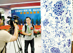 7月19日9時30分,北京地鐵十號線一期、奧運支線、機場線開通儀式在北土城地鐵站內(nèi)舉行。參加開通儀式的100多名中外記者,被地鐵站內(nèi)眾多立柱上的牡丹圖案吸引,紛紛拍攝鏡頭,不少志愿者還在牡丹圖案前合影留念。