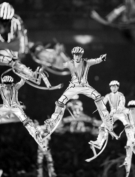 2008年8月24日晚,奧運(yùn)會(huì)閉幕式上,199名少年穿著特制的足具——一副由白色的金屬制成的高約一米、裝有彈簧的支架走上了閉幕式的表演舞臺(tái)。199名少年整齊劃一的前空翻、后空翻、橫飛,引起現(xiàn)場(chǎng)觀眾陣陣尖叫和掌聲。