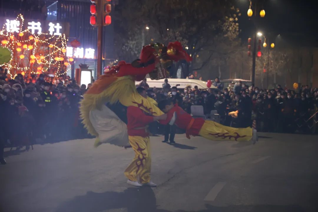 “咚咚鏘,咚咚鏘……”當(dāng)晚7時(shí),伴隨著喧天的鑼鼓聲,受邀前來的社火隊(duì)伍換上了節(jié)日的盛裝,踏著喜慶的鼓點(diǎn),和著歡快的節(jié)拍走進(jìn)朝歌老街文昌閣廣場(chǎng)。盤鼓、舞龍、踩高蹺、竹馬、戲獅等精彩節(jié)目接連上演,演員們個(gè)個(gè)精神抖擻、喜氣洋洋,觀眾們熱情高漲,現(xiàn)場(chǎng)瞬間變成了一片歡樂的海洋,大家沉浸在濃濃的節(jié)日氛圍里,感受著傳統(tǒng)佳節(jié)獨(dú)有的魅力。