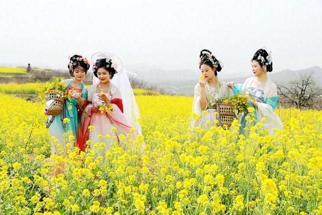 3月30日,四位穿漢服的少女在禹州市方山鎮(zhèn)押莊村千畝油菜園打卡拍照。陽春三月,春意盎然,押莊村千畝油菜園內(nèi),油菜花競相怒放,一層層、一片片,密密匝匝,漫山遍野,蔚為壯觀。游客徜徉花海,沐浴春光,流連忘返。