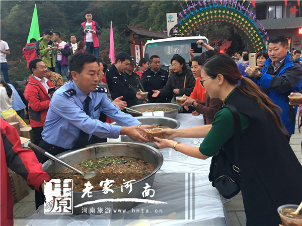 記者在現(xiàn)場看到,旅游警察們免費(fèi)發(fā)放的“暖身湯”是由土豬肉、木耳、香菇、豆腐、粉條等山里人的特色吃食熬制而成,湯稠肉多,所有的游客都可以免費(fèi)領(lǐng)食,免費(fèi)加食,吃飽為止。