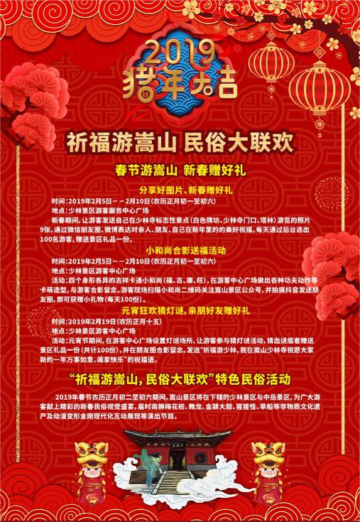 辭舊迎新時(shí),祈福好運(yùn)來。嵩山景區(qū)2019年農(nóng)歷新春將通過一系列年味十足的大型民俗活動,深度詮釋中華節(jié)侯文化的精髓,為大家描繪一幅“最中國”的盛世新春盛景圖。歡迎廣大游客和親朋好友在2019年來嵩山景區(qū)辭舊歲、迎新春!