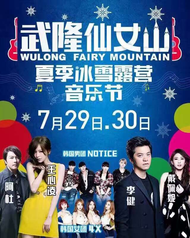 本次音樂節(jié)明星演唱時間及票價分別為7月29日:王心凌、阿杜、韓國男團Notice及6支川渝知名樂隊,票價198元/張;7月30日:李健、戴佩妮、韓國女團4x及6支川渝知名樂隊,票價298元/張。需特別說明的是,以上兩種票價均包含仙女山景區(qū)門票,購票咨詢請撥打武隆旅游票務(wù)熱線023-63811176。