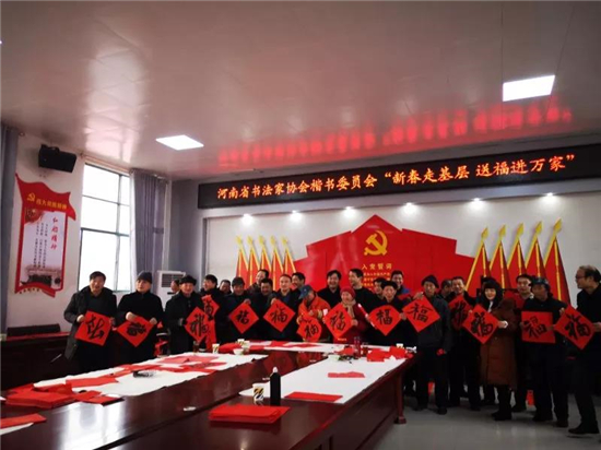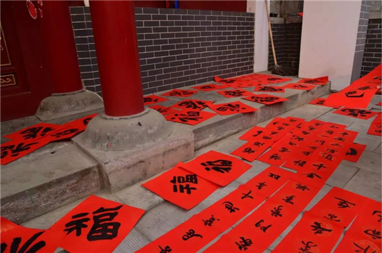 20日上午,各位書家前往新中鎮(zhèn)政府和杜家祠堂舉行“送萬福、進(jìn)萬家”寫春聯(lián)公益活動(dòng),送與當(dāng)?shù)乩习傩铡?/p>